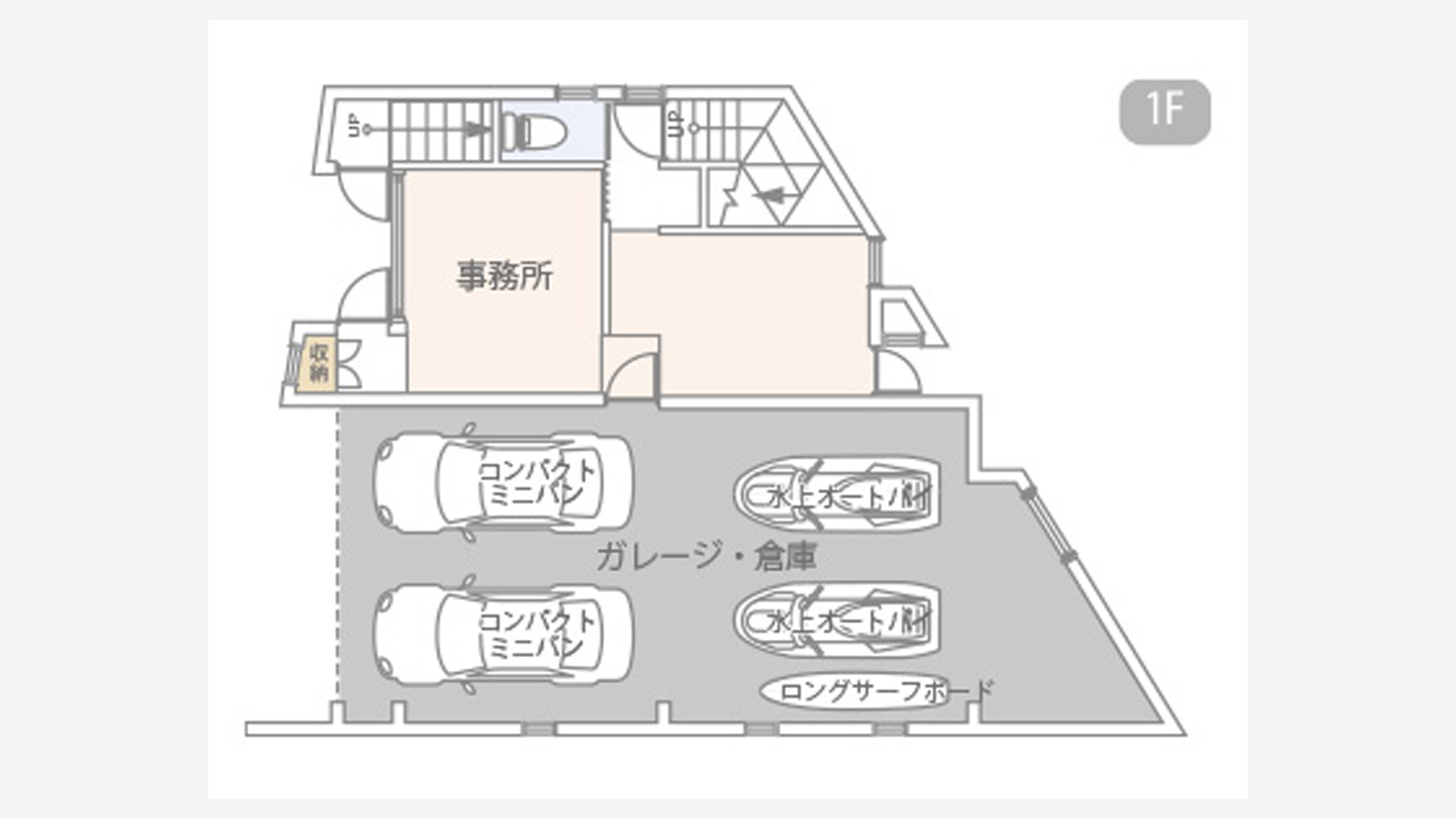 ◇56.71m²の大型ガレージにはマリンスポーツ用品も収納可能